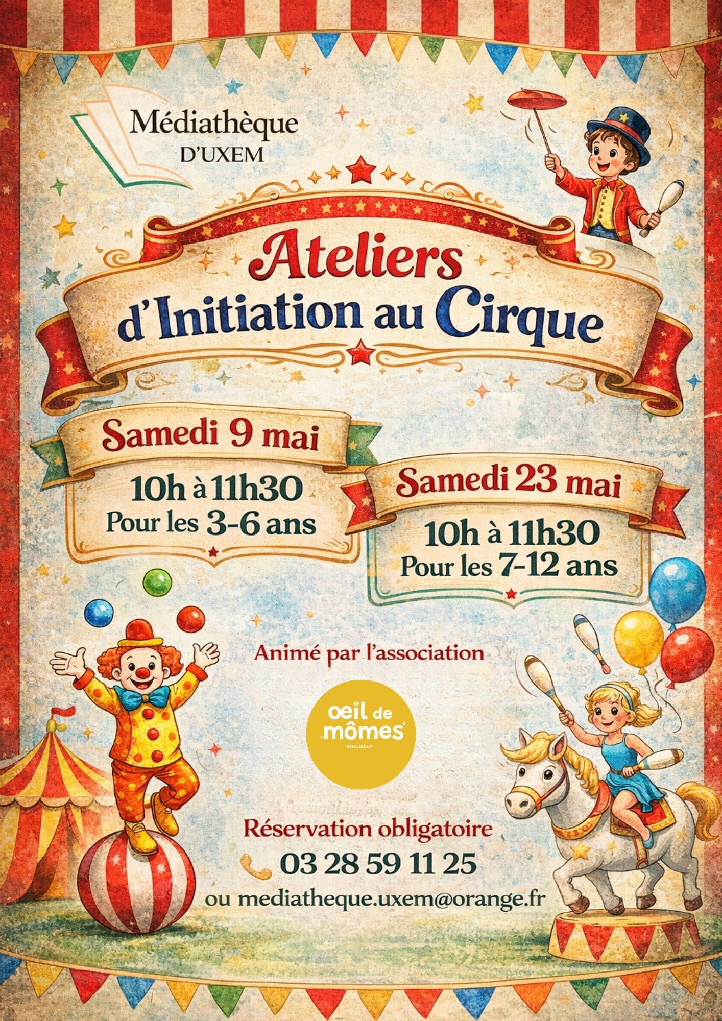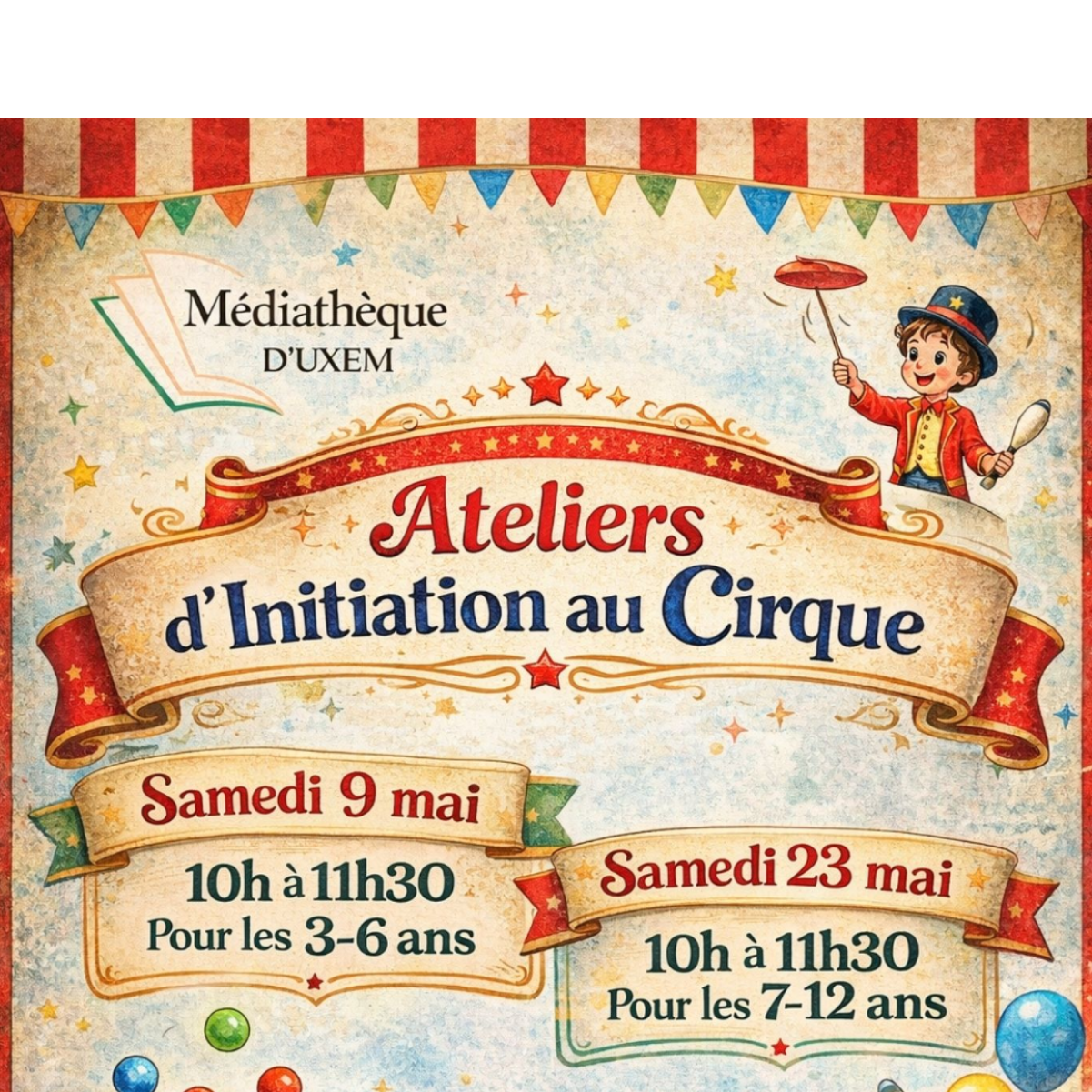 En mai, la médiathèque d’Uxem met le cirque à l'honneur. Pour l'occasion, elle propose aux enfants de 3 à 6 ans et de 7 à 12 ans un atelier d'initiation.